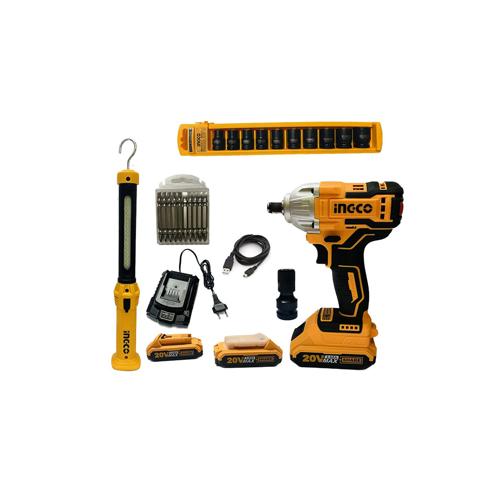 Voltage:20V With 1pcs lithium-ion impact wrench(CIWLI2038) With 1pcs lithium-ion impact wrench(CIWLI2038) With 1pcs work lamp(HWLI35261) Lithium-ion impact wrench(CIWLI2038): Brushless motor Voltage:20V Square drive:1/2″ No-load speed:0-1300/0-2300rpm Impact rate:0-2000/0-3300bpm Max torque:300Nm Integrated LED work light Work lamp(HWLI35261) Using Li-polymer rechageable battery Lumens: Max:300±10% |